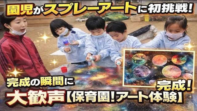 初めてスプレーで絵を描く園児のワクワクした楽しそうな様子をみてね♪